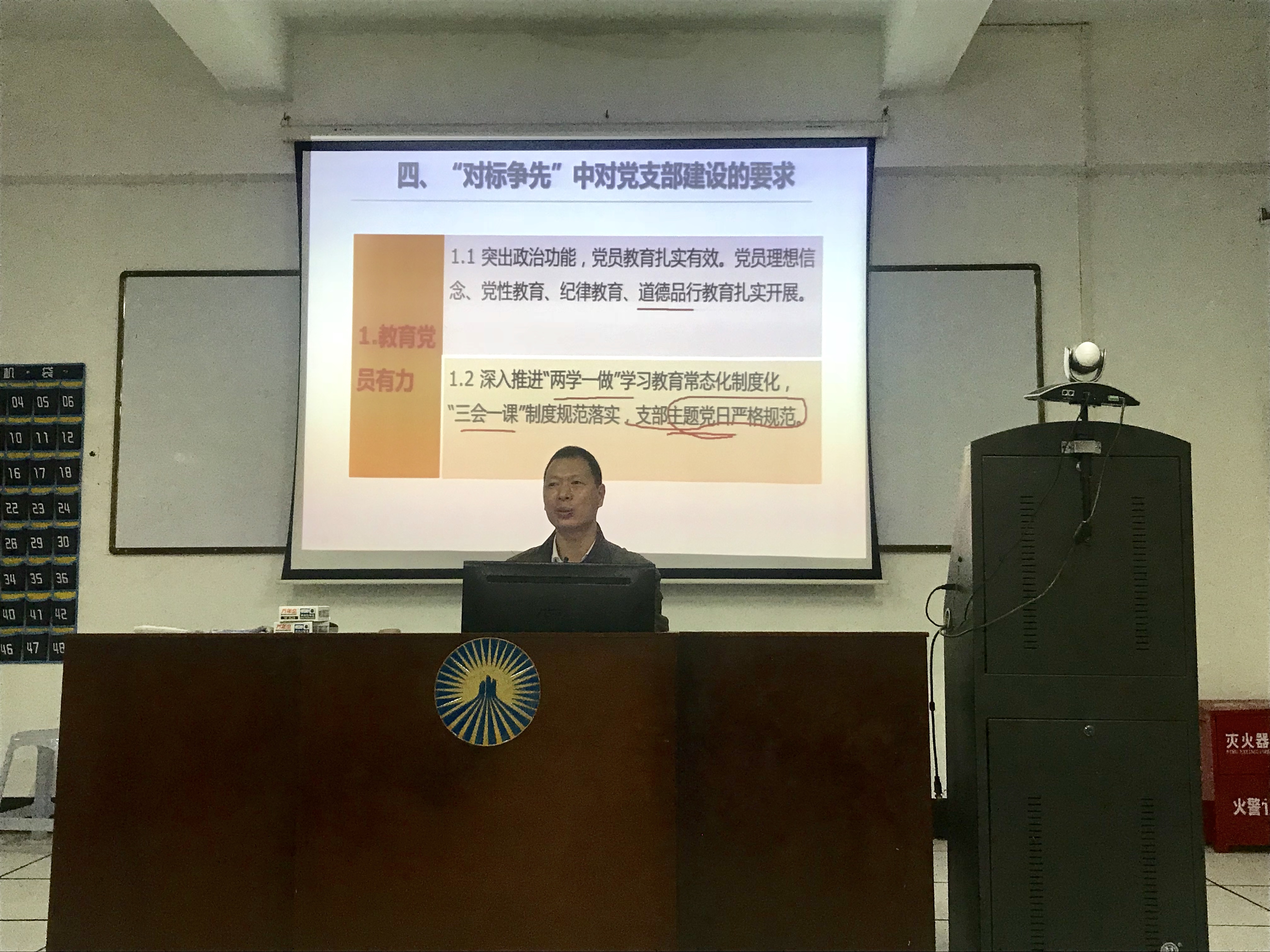 院党总支书记曾凤生从何为“对标争先”、“对标争先”的总体要求、什么是“十百千万”工程、“对标争先”对党支部的要求、“对标争先”中党员的行动和责任等五个方面详细解读“对标争先”。曾书记表示,全体师生党员要紧跟党的脚步,落实贯彻习近平新时代中国特色社会主义思想和党的十九大精神,学习党章党规,做一名合格党员。支部把政治建设摆在首位,积极寻找问题和差距、突出问题导向,提升党建工作质量,树立先进典型,并做好推广和宣传;建设标准化党组织,严格落实“三会一课”,努力做到“七个有力”,切实提高党员的培养质量,最后曾书记表示学院总支就是为师生解决问题,提供服务,做好交流。