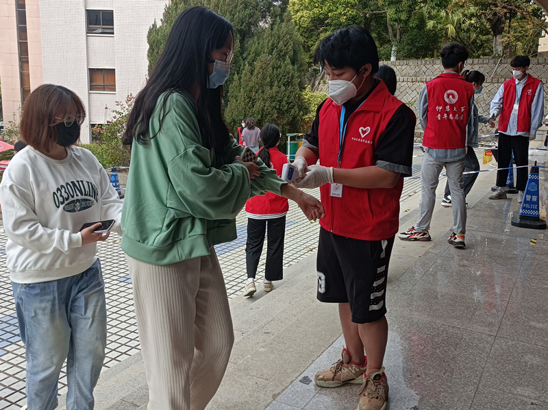 在开展全员核酸检测中,我支部党员志愿者们早早在检测现场各个卡口值班防守,严格按照学校部署要求执行相关制度,积极引导学生正确佩戴口罩、测量体温;做好核酸检测工作的流程指引,采样现场秩序的维护,核酸检测信息的核实录入等等,确保任务区域点核酸采样工作的高效完成。