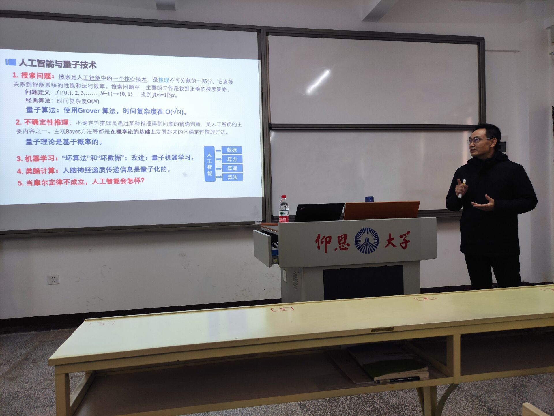 2021年1月6日下午,在第一教学区吉隆楼304,南通大学博士生导师管致锦教授应邀来校作《传统计算视角下的量子计算——可逆(量子)线路映射问题》讲座,校长助理鲍莹玉、校长助理石羊、我院全体教师与学生代表一同聆听此次讲座。 讲座上,管教授分析了传统计算的局限,通过大量实例生动形象地诠释量子计算研究内容与研究方法、可逆计算与量子计算的关系,可逆计算的主要研究领域以及人工智能与量子技术的融合点等内容。同时结合自身研究工作展示量子计算的应用领域的可实践性,拓宽了广大师生的视野。