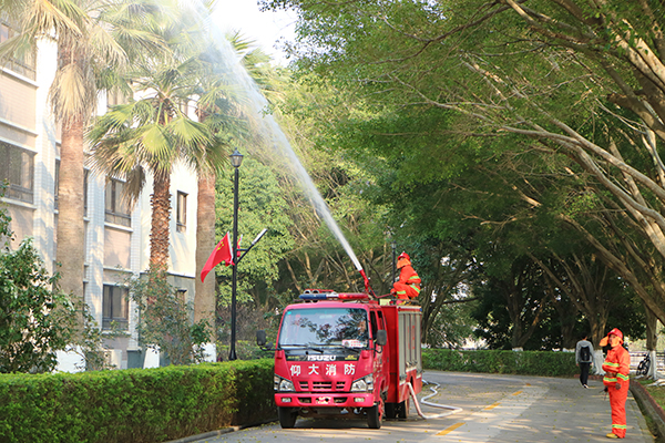 消防疏散演练以实验室线路老化,引起火灾为背景,内容包括逃生演练、消防灭火排烟、医疗救护等环节。随着现场阵阵浓烟升起,本次消防演练拉开了帷幕。值班安保人员发现火情后,迅速通知校园110联动指挥中心。指挥中心立即启动应急预案,通知校微型消防站、雏鹰应急处置分队、校医务所迅速前往灾现场,并通知马甲消防救援站前往支援。同时,工作人员组织学生用湿毛巾捂住口鼻,弯腰,分别从正、侧门撤离至湖边舞池安全地带。雏鹰应急处置分队队员负责引导学生有序撤离火灾现场,并为现场拉起警戒线。校医务所工作人员对受伤学生进行医疗救护。最终,在校微型消防站和马甲消防救援站共同配合下,火情成功解除。在此次演练过程中,学生听从指挥,沉着应对,有条不紊地撤离现场,在多方校园力量的配合下,此次消防演练圆满结束。演练后,消防员为我院师生详细讲解灭火器材使用方法,并组织师生进行了灭火器扑灭初期火灾实操练习。