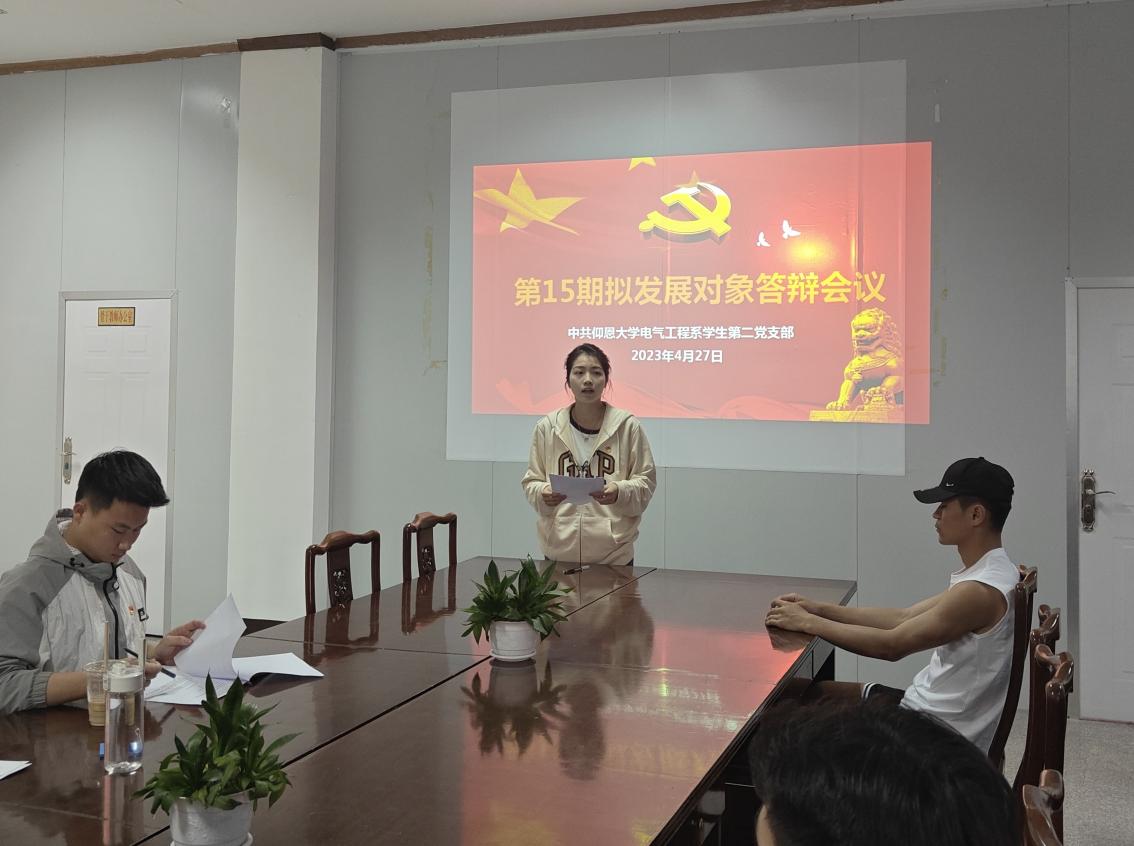为确保党员发展质量,严把党员入口关,加强学生党支部队伍的建设,开云kaiyun官方网站电气工程系学生第二党支部于4月27日下午,在泽钏楼四楼会议室召开了拟发展对象答辩会议。电气系学生第二党支部书记陈慧敏老师,电气系学生第二党支部组织委员林嘉豪老师以及全体学生党员、部分入党积极分子参加了本次会议,由陈慧敏、林嘉豪和四位学生党员代表担任评审团。