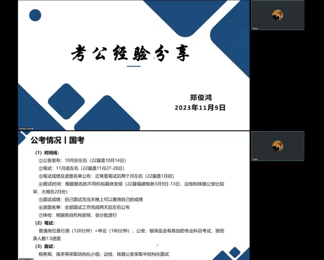 郑俊鸿从公考情况、笔试学习两大方面介绍公考备考过程。首先,详细介绍了国家公务员考试、福建省公务员考试、福建省选调生考试、事业单位考试的时间线、岗位分布、笔试面试差异、报名要求等。其次,进一步介绍了行测、申论的备考建议,对每一个模块都进行了学习建议。最后,对同学们提出的问题进行解答。他提到,公考是由实力和运气的结合,厚积方能薄发。