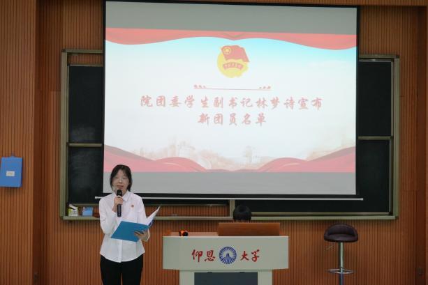 本次入团仪式在庄严而嘹亮的国歌声中拉开帷幕。院团委学生副书记林梦诗说明入团仪式的意义,并宣读新团员名单。随后,由学院党总支书记曾凤生、党总支副书记苏荣堃以及各系团总支书记为新团员代表佩戴团徽,颁发团章、团员证。所有新入团的团员们在院团委学生副书记李轶迎的带领下,面向团旗庄严宣誓,老团员们重温入团誓词。入团介绍人代表叶嘉琪宣读《团章》中有关团员的义务和权利的条款,促进新团员理解并珍视作为团员所拥有的权利和义务。