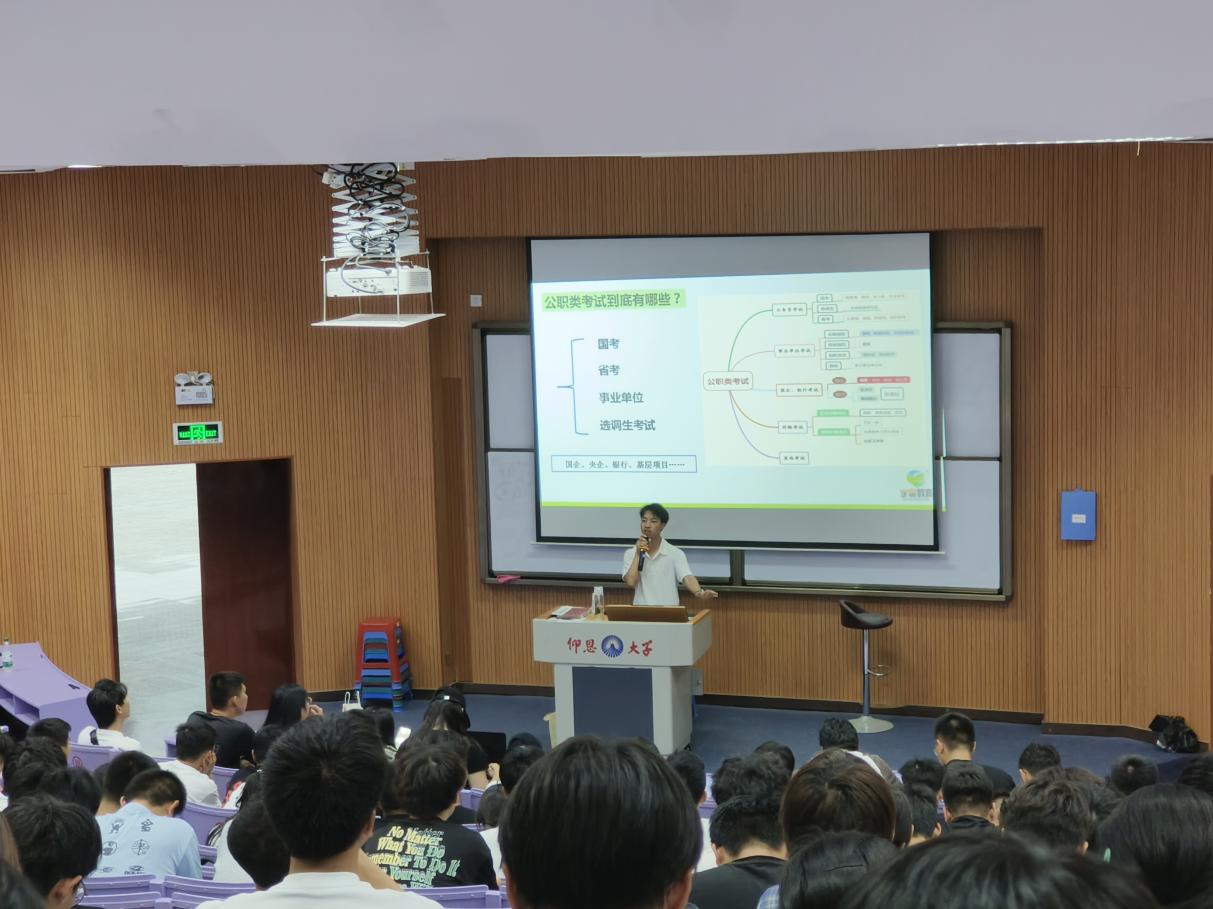 讲座中,谢老师与同学们讨论了大学生毕业后的就业方向,特别介绍了公职类考试,并强调了基层项目如三支一扶、志愿服务等作为公考跳板的优势。