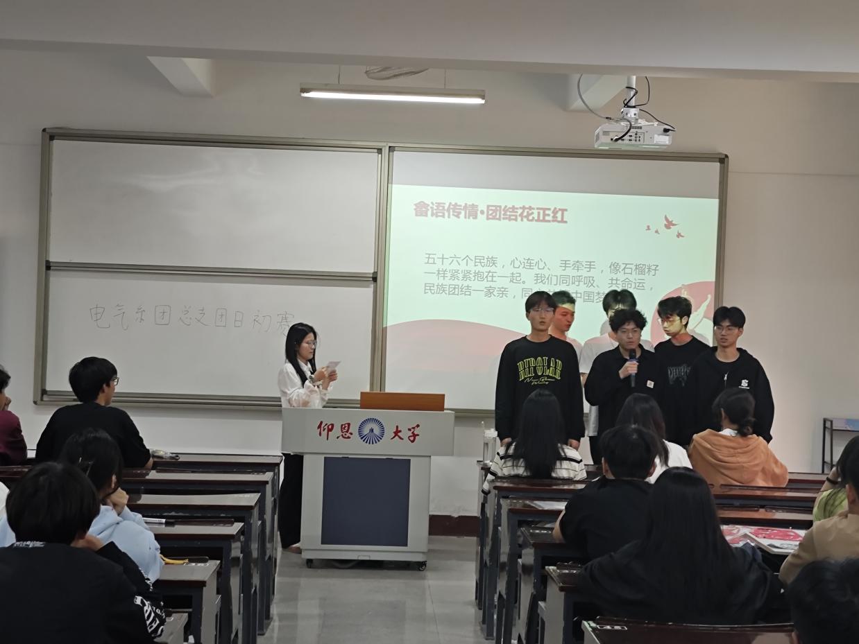 为响应国家民族团结号召,促进各民族同学之间的交流与融合,引导同学们树立正确的民族观,2025年4月14日下午,电气工程及其自动化系团总支成功举办“民族团结一家亲,福籽同心爱中华”主题团日活动初赛,引领青年学子铸牢中华民族共同体意识。本次活动由程健凯主持,电气系团总支书记陈慧敏、学生副书记欧阳翔、张曦文及系团委办公室主任程健凯、副主任伍勇担任评委。