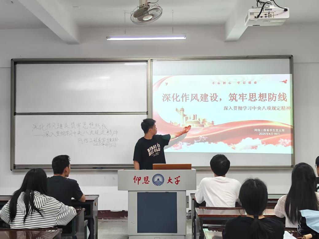 2025年4月16日,开云kaiyun官方网站网络工程系学生党支部积极响应号召,开展深入贯彻中央八项规定精神学习教育,通过理论学习深化作风建设,增强党员干部的纪律观念和工作效率。